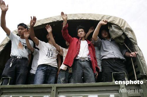 5月28日,四川平武縣南壩鎮(zhèn)19名受災(zāi)青年集體前往沈陽打工謀生自救,在搭乘軍車離開時(shí),揮手告別家鄉(xiāng)。平武縣在5. 12地震中損失慘重,25個(gè)鄉(xiāng)鎮(zhèn)18.6萬人全部受災(zāi)90%以上房屋全部倒塌,截止27日16時(shí),該縣3014人死亡,3555人失蹤。中新社發(fā) 杜洋 攝