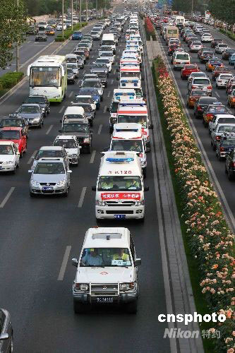 圖:北京91輛救護(hù)車連成傷員生命線