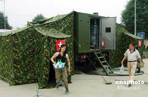 圖:濟(jì)南軍區(qū)野戰(zhàn)淋浴車開(kāi)進(jìn)都江堰災(zāi)區(qū)