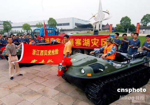 5月30日上午,浙江義烏,兩輛“西貝虎”水陸兩棲全地形車啟程前往四川北川唐家山堰塞湖搶險。目前唐家山堰塞湖的總儲水量已達1.4億立方米,而且每天以500立方米的速度遞增,一旦發(fā)生潰壩,將危及下游130多萬人的生命財產(chǎn)。28日剛從什邡回來的義烏西貝文良特種車輛有限公司領導,又接到唐家山堰塞湖防洪搶險指揮部急需用水陸兩棲全地形車電話。該公司連夜組織加班,突擊生產(chǎn)了兩輛性能最優(yōu)的水陸兩棲全地形車,并根據(jù)唐家山堰塞湖搶險可能遇到的困難,增配了自動牽引鉤、牽引鋼絲繩、爬坡履帶、水上推進的螺旋槳等。30日中午,陳根林等四名剛從什邡抗震救災前線回來的公司職工,組成“西貝虎”搶險突擊隊,再赴抗震救災前線搶險。中新社發(fā) 張建成 攝