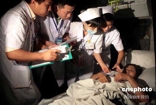 六月一日晚十一時(shí)許,四十位四川地震傷員轉(zhuǎn)移抵達(dá)福建泉州,分乘救護(hù)車(chē)前往泉州四家醫(yī)院接受救治。在救護(hù)車(chē)上,交接醫(yī)生第一時(shí)間了解病人情況并做出移動(dòng)方案。中新社發(fā) 傅丹丹 攝