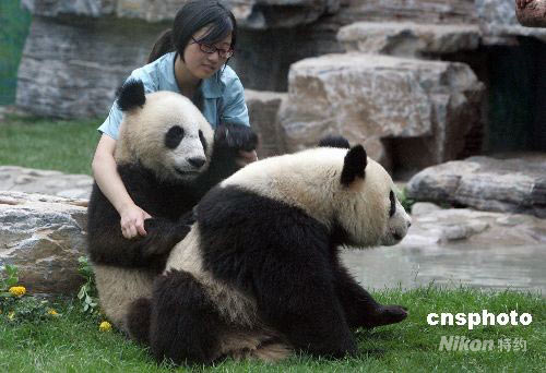 6月2日,一對雌雄“奧運大熊貓寶寶”在北京動物園新家依偎在一直照料它們的臥龍女飼養(yǎng)員身邊玩耍。5月24日從四川地震災(zāi)區(qū)運抵北京的八只臥龍“奧運大熊貓寶寶”,經(jīng)過多日的精心照料已基本從大地震的陰影中解脫出來。從6月5日開始,公眾可以在這里盡情觀賞它們的風(fēng)采。 中新社發(fā) 任晨鳴 攝