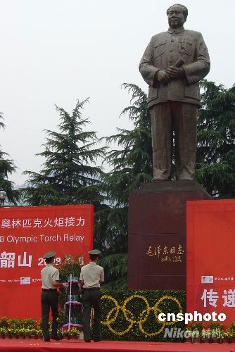 圖:北京奧組委官員向毛澤東銅像敬獻(xiàn)花籃