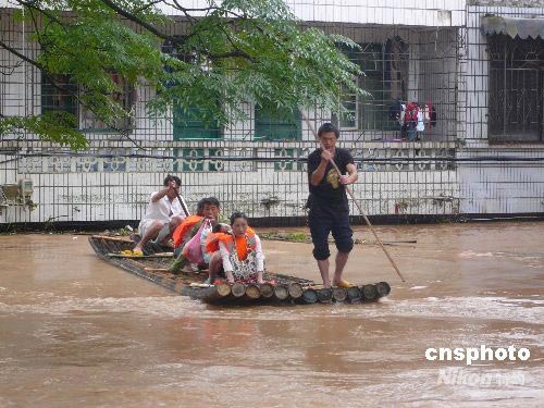 6月11日至13日凌晨,永?h普降特大暴雨,降雨量高達346.3毫米,縣城東河和西河的洪水水勢兇猛,西河水最高達到143.45米,超過警戒水位5.45米。截止到13日10時許,永福全縣被洪水圍困民眾4900人,緊急轉(zhuǎn)移安置民眾4600多人。圖為救援人員正奮力轉(zhuǎn)移被洪水圍困的民眾。中新社發(fā) 周利朔 攝