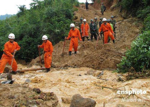 6月13日凌晨,連日大雨致廣西賀州市黃田鎮(zhèn)浩洞村山體滑坡,造成一民房內(nèi)3名礦工兩人死亡,一人失蹤。圖為賀州消防官兵正在現(xiàn)場進(jìn)行搜救。中新社發(fā) 周自金 攝