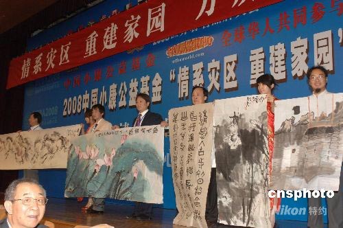 6月15日,百名畫家在北京全國人大會(huì)議中心出席2008中國小康公益基金“情系災(zāi)區(qū)、重建家園”推動(dòng)大會(huì)暨中國當(dāng)代百名畫家賑災(zāi)義捐獻(xiàn)愛心活動(dòng)。該活動(dòng)是由文化部中華社會(huì)文化基金會(huì)、中國小康公益基金、美中經(jīng)貿(mào)投資總商會(huì)、世界著名品牌大會(huì)等單位共同主辦!爸袊】倒婊稹庇晌幕恐腥A社會(huì)文化發(fā)展基金會(huì)組建。中新社發(fā) 鄒憲 攝