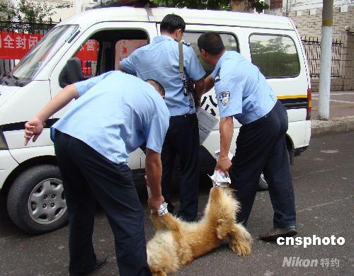 2008年6月16日中午,一條瘋狗闖進河南省武陟縣城和平路縣直幼兒園附近并在圍墻邊游蕩,見人就咬,連續(xù)咬傷5名過往行人。此時已接近放學(xué)高峰,一旦咬傷學(xué)生后果不堪設(shè)想。武陟縣110接到群眾報警后,立即出動4名警力攜帶微沖等捕殺工具趕至現(xiàn)場,經(jīng)過20多分鐘追擊堵截,警察最終將瘋狗逼到一小胡同內(nèi),一名警察僅開一槍就將瘋狗打死。目前,被瘋狗咬傷的人員仍在醫(yī)院搶救。中新社發(fā) 雒根生 攝