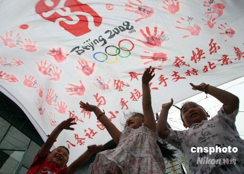 6月17日,距離北京奧運(yùn)會還有52天,北京奧林匹克社區(qū)的50多位市民聚集在一起,在印有奧運(yùn)會會徽的旗幟上印下自己的手印,共同迎接奧運(yùn)會倒計(jì)時50天。 中新社發(fā) 杜洋 攝