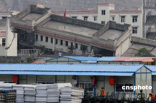 廣東省定點援建四川汶川大地震震中地區(qū)映秀鎮(zhèn),六月以來廣東省援建隊一直在該鎮(zhèn)漩口中學即將清理的廢墟旁開闊地搶建活動木屋區(qū)。中新社發(fā) 賈國榮 攝