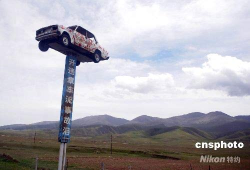6月23日,青海省青海湖交通管理部門(mén)將事故真車架在寫(xiě)有交通警示語(yǔ)的柱子上,警示交通安全。中新社發(fā) 廖攀 攝