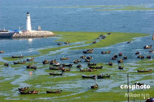 6月25日,2008北京奧運會奧帆基地海域正在打撈滸苔。近日,青島海域滸苔泛濫,有關(guān)方面加緊打撈。中新社發(fā) 呼蘭江 攝