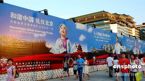 7月6日,北京西單街頭奧運(yùn)宣傳畫格外引人注目。隨著奧運(yùn)會(huì)臨近,北京大街小巷的奧運(yùn)氣息越來越濃。 中新社發(fā) 張愛東 攝