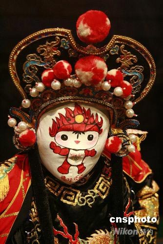 四川遂寧市川劇團(tuán)變臉大師劉世虎在舞臺上表演川劇絕活——變臉,奧運福娃、奧運徽標(biāo)、中國國旗在他臉上一一展示。中新社發(fā) 鐘 敏 攝