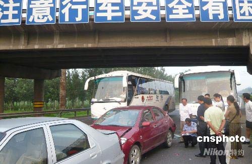 京津高速安全行駛標(biāo)語(yǔ)下的車禍。7月18日18點(diǎn),在天津通往北京的高速公路上,3輛轎車、1輛大巴車、1輛滿載乘客的機(jī)場(chǎng)大巴車追尾相撞,事故無(wú)人傷亡,但造成交通堵塞,公安交警及時(shí)趕到進(jìn)行了處理。中新社發(fā) 錢興強(qiáng) 攝