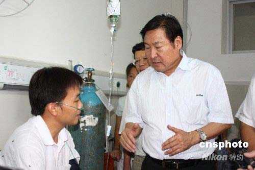 7月24日,廣西田東縣那讀煤礦透水事故已經(jīng)過(guò)去3天,國(guó)家煤礦安監(jiān)局局長(zhǎng)趙鐵錘(右)到醫(yī)院看望獲救礦工韋明輝,了解當(dāng)時(shí)事故發(fā)生情況。中新社發(fā) 曾德軍 攝