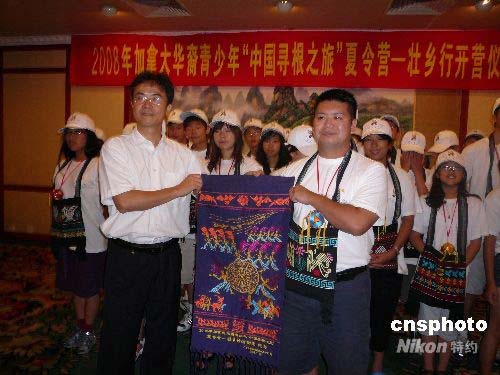 7月25日,由39名加拿大華裔青少年組成的“中國尋根之旅”夏令營在國際旅游名城桂林開營,廣西區(qū)僑辦官員給夏令營增送壯族禮物“壯錦”。據(jù)介紹,此次為期9天的夏令營活動是由中國國務(wù)院僑務(wù)辦公室主辦,廣西區(qū)僑辦承辦,夏令營成員將游覽廣西桂林、南寧、北海3個(gè)旅游城市,學(xué)習(xí)中國文化常識,了解廣西民族民俗風(fēng)情。中新社發(fā) 周利朔 攝