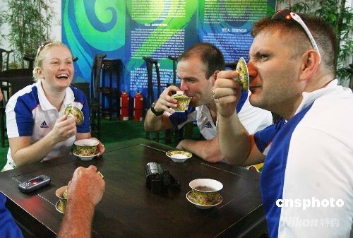 7月28日,英國跳水運(yùn)動員以十分夸張的表情,在北京奧運(yùn)村國際區(qū)輕松品味中國茶文化。中新社發(fā) 武仲林 攝