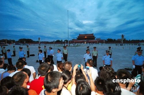 2008年8月1日為我解放軍建軍81周年紀(jì)念,天安門廣場(chǎng)舉行盛大升旗儀式,各地游客、奧運(yùn)期間造訪北京的外國(guó)友人一同觀看。中新社發(fā) 侯宇 攝