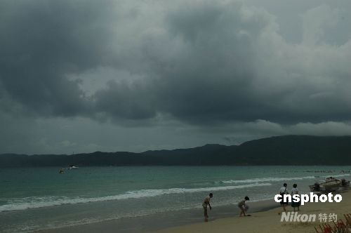 8月6日,受強(qiáng)熱帶風(fēng)暴“北冕”影響,海南三亞亞龍灣國家旅游度假區(qū)上空烏云密布,降雨不斷,沙灘上的游人相較往日有所減少。中新社發(fā) 尹海明 攝