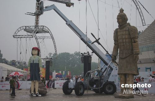 8月11日,《勇士和女孩》巨型木偶劇在在北京中華世紀(jì)壇奧運(yùn)活動(dòng)現(xiàn)場(chǎng)出演。主角是兩個(gè)高達(dá)22英尺(約6.7米)的提線木偶,演繹一個(gè)中國(guó)女孩和秦始皇兵馬俑之間的溫馨故事,通過(guò)古代與現(xiàn)代、智慧與天真兩個(gè)迥乎不同的形象突出了戲劇效果,體現(xiàn)了關(guān)愛(ài)、善良和友誼永恒等精神價(jià)值。中新社發(fā) 九州 攝