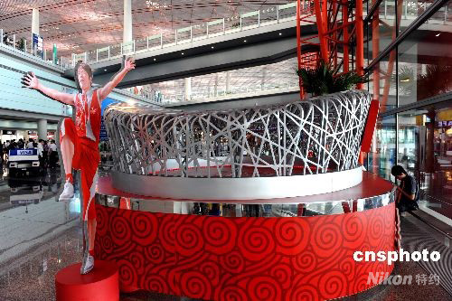 8月12日,北京首都機場T3航站樓搭建一處類似于“鳥巢”體育館的景觀,歡迎奧運賓朋。 中新社發(fā) 廖攀 攝