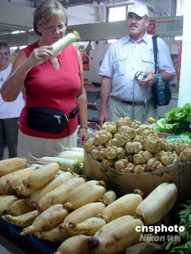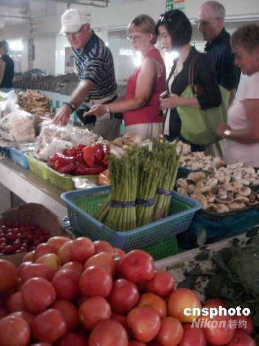 2008年9月1日,外國(guó)游人在蘇州雙塔菜場(chǎng)游覽。如今到蘇州旅游的外國(guó)游人越來越多,他們?cè)谟斡[古典園林的同時(shí),蘇州的菜市場(chǎng)也成為“老外”游客游覽的新景點(diǎn)。市場(chǎng)內(nèi)豐富的農(nóng)產(chǎn)品和當(dāng)?shù)匕傩丈钗恕袄贤狻眰兊哪抗。中新社發(fā) 王建康 攝