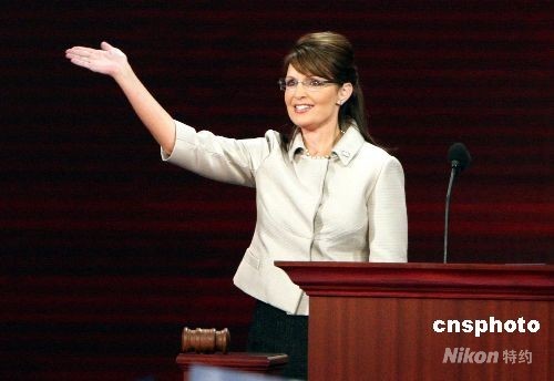 美國(guó)阿拉斯加州州長(zhǎng)薩拉·佩林,九月三日在明尼蘇達(dá)州州府圣保羅舉行的共和黨全國(guó)代表大會(huì)上發(fā)表接受提名演說,成為共和黨歷史上首位女副總統(tǒng)候選人。中新社發(fā) 李靜 攝