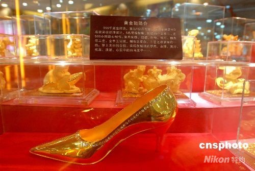 9月3日,在遼寧沈陽一黃金商店的柜臺內(nèi),一只一公斤重的純金高跟鞋吸引了很多顧客的目光。這只金鞋使用999千足金打造,5名技師歷經(jīng)48個工作日才完成。中新社發(fā) 孫海 攝