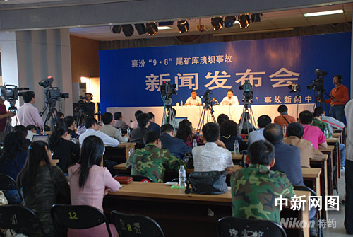 9月11日上午11時許,山西襄汾“9.8”尾礦庫潰壩事故舉行第一次新聞發(fā)布會,發(fā)布會在襄汾縣一家賓館內(nèi)舉行。山西省委宣傳部副部長楊波主持會議,山西省政府秘書長王清憲發(fā)布事故有關情況。記者:張雷杰 攝