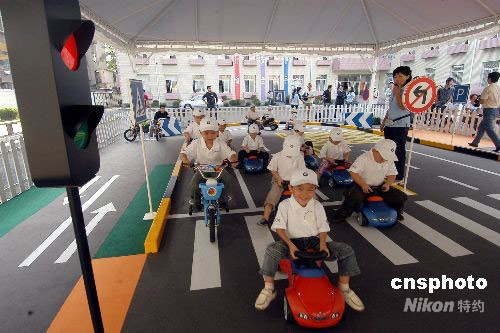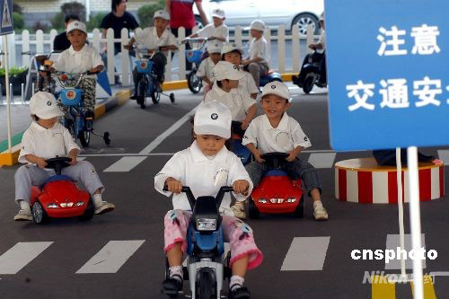9月11日,為期三天的2008BMW兒童交通安全訓(xùn)練營(yíng)沈陽(yáng)站在和平區(qū)少年宮開(kāi)營(yíng)。在BMW兒童交通安全主題公園里,十字路口、交通崗、紅綠燈、斑馬線、雙黃線、警示牌等一應(yīng)俱全。來(lái)自沈陽(yáng)多所幼兒園的80名孩子駕駛著玩具寶馬汽車、摩托車和自行車行駛在這一個(gè)“縮小版”的繁華街道上。中新社發(fā) 文契 攝