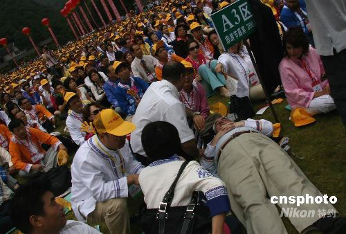 9月12日上午,2008年中國湖南國際旅游節(jié)在張家界國家森林公園開幕,湖南借助國際旅游節(jié)這一機(jī)遇向世界展示自身獨(dú)特的旅游資源和旅游產(chǎn)業(yè)發(fā)展?fàn)顩r。500余名境內(nèi)外旅行商和媒體記者受邀觀看開幕式表演,一位胖老外坐著看覺得不舒服,直接躺在草地上,引起了一場(chǎng)小誤會(huì)。中新社發(fā) 張家根 攝