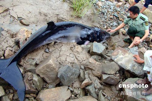 9月13日上午,一條鯨魚(yú)受強(qiáng)臺(tái)風(fēng)“森拉克”影響而迷失了航向,擱淺在浙江溫州市靈昆島的灘涂上。發(fā)現(xiàn)受傷鯨魚(yú)后,靈昆邊防派出所官兵迅速展開(kāi)營(yíng)救,和當(dāng)?shù)厝罕娨黄饘R淺鯨魚(yú)送歸大海。據(jù)悉,該鯨魚(yú)長(zhǎng)約2.5米,重約700余斤,尾部被巖石刮傷,屬于須鯨類(lèi)。中新社發(fā) 吳水斌 攝