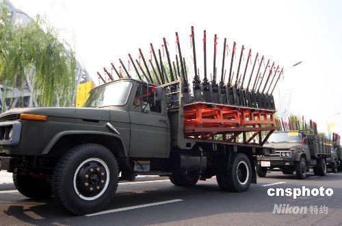9月17日下午,多輛焰火禮炮專用車開到國家體育場“鳥巢”,迎接2008北京殘奧會閉幕式。 中新社發(fā) 吳芒子 攝