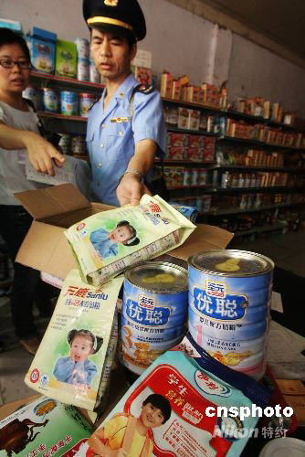 9月20日,鄭州又一些超市將問題奶粉下架。自國家質檢總局公布嬰幼兒奶粉生產企業(yè)排查結果之后,鄭州市工商局當即下發(fā)緊急通知要求徹查問題奶粉。目前,很多超市、商戶紛紛將問題奶粉下架,廠家將無條件退貨。中新社發(fā) 慎重 攝