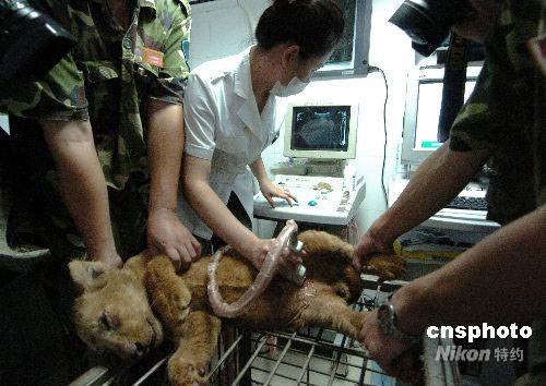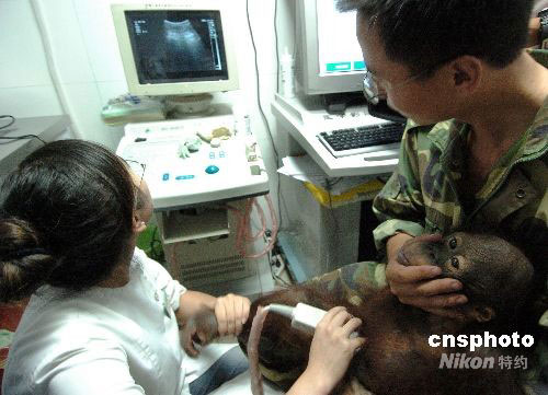 9月24日下午,杭州一家動(dòng)物醫(yī)院為杭州野生動(dòng)物園的一只幼年非洲獅和兩只幼年紅毛猩猩進(jìn)行腎結(jié)石檢查,檢查結(jié)果,這三只小動(dòng)物均有輕度至中度的腎結(jié)石癥狀。 據(jù)了解,該動(dòng)物園近兩年來一直選用“三鹿”牌奶粉輔助喂養(yǎng)部分動(dòng)物幼崽,今年上半年以來,喂食奶粉的幼年獅、虎、猩猩、絨猴等普遍出現(xiàn)排尿淋漓,尿液發(fā)黃、渾濁,營養(yǎng)不良等癥狀。中新社發(fā) 施健學(xué) 攝