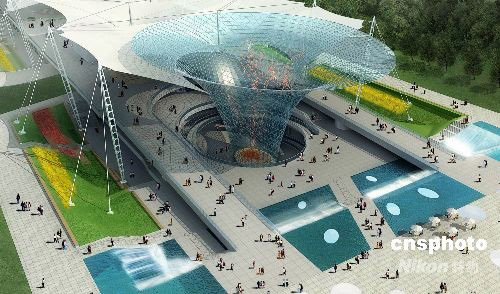 2010年上海世博會(huì)中央景觀道路“世博軸”進(jìn)入全面施工階段,圖為首次公布的“世博軸”主出入口“陽光谷”造型效果。據(jù)介紹,“世博軸”的一端也是上海世博園區(qū)的主出入口,整個(gè)“世博軸”在入口及沿途共設(shè)6個(gè)巨型圓錐狀“陽光谷”!瓣柟夤取辈捎娩摻Y(jié)構(gòu),其功能是讓自然光透過透明“圓錐”傾瀉入地下,滿足部分地下空間的采光,實(shí)現(xiàn)節(jié)能環(huán)保。 中新社發(fā) 世博局 攝