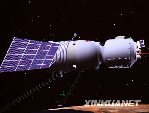 圖:神舟七號載人飛船在太空遨游模擬圖