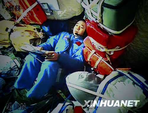 9月27日,航天員景海鵬在神舟七號(hào)載人飛船返回艙與地面通話(huà)(攝于北京航天飛行控制中心大屏幕)。當(dāng)日中午,航天員出艙活動(dòng)任務(wù)開(kāi)始。新華社記者查春明攝