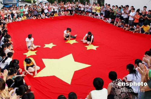 9月27日下午,隸屬于江西省上饒經濟開發(fā)區(qū)的臺資企業(yè)江西宏福服裝公司廠區(qū)內,幾百名縫紉女工匯集一起,共同縫制了一幅長10米、寬7米的巨型五星紅旗,并以此來慶祝祖國59華誕和神七順利飛天,表達出他們熱愛祖國的心情。中新社發(fā) 卓忠偉 攝