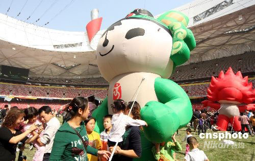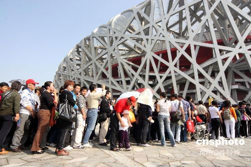 9月30日,“十一”國(guó)慶長(zhǎng)假第二天,旅游黃金周進(jìn)入高潮,到北京旅游的各地游客都渴望進(jìn)入北京奧運(yùn)會(huì)主體育場(chǎng)“鳥(niǎo)巢”,有幸購(gòu)到參觀票的游客在鳥(niǎo)巢盡情玩耍拍照。中新社發(fā) 吳芒子 攝