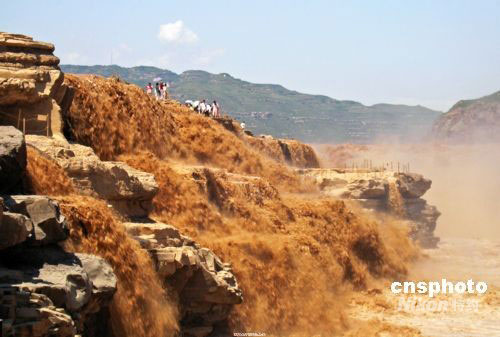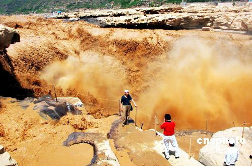 2008年10月1日,游人在黃河壺口處游覽,拍照留念。位于陜西宜川縣和山西吉縣交界處的黃河壺口瀑布,有“天下黃河一壺收”之譽(yù),主瀑布寬約40米左右,落差40米以上,今年上游來(lái)水量增加,壺口瀑布流量隨之增加,“十一”黃金周吸引了眾多游客。中新社發(fā) 沙漠 攝