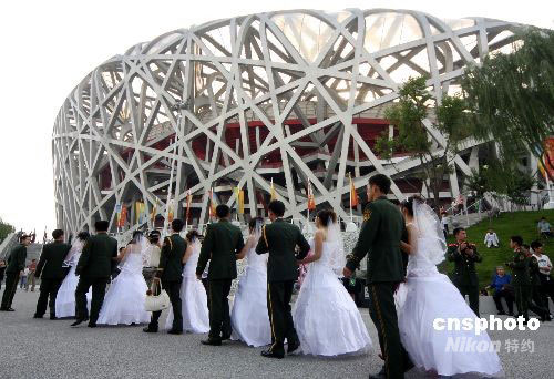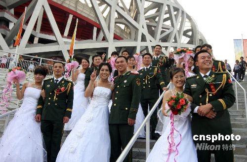 9月30,喜結(jié)良緣的奧運(yùn)安保武警與新娘在國(guó)家體育場(chǎng)“鳥巢”前集體留影。當(dāng)天,武警十三支隊(duì)21位奧運(yùn)安保武警在數(shù)次推遲婚期后,終于步入婚姻殿堂。據(jù)了解,這21位武警戰(zhàn)士從今年初開始就沒有休過一天假,原定的婚期一拖再拖,直到奧運(yùn)結(jié)束后,才定為國(guó)慶節(jié)期間完婚。中新社發(fā) 吳芒子 攝