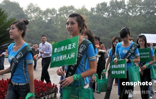 2008年10月3日,參加“中國國際年度綠色風(fēng)云人物”頒獎盛典暨“MISS EARTH世界綠色環(huán)保大賽中國總決賽”的來自全國27個省、直轄市、自治區(qū)的40位“綠色天使”手拿宣傳牌、環(huán)保袋等物品來到南京中山陵風(fēng)景區(qū),參加公益環(huán)保宣傳活動。中新社發(fā) 劉建民 攝