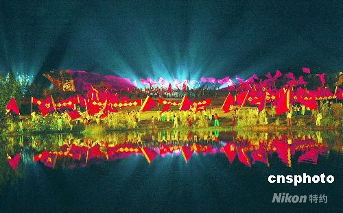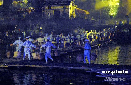 十月六日晚八時,江西省首個大型戶外實景演出《井岡山》,再現當年八十年前紅軍挑糧上井岡山情景。這場《井岡山》的演出由近千名當地農民參演,采用一千多盞燈光、五萬五千多平方米的舞臺。中新社發(fā) 段長征 攝