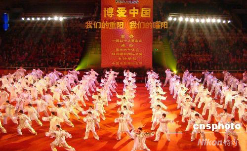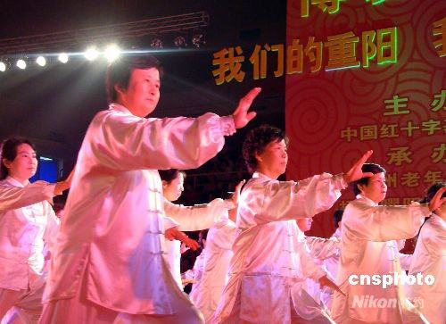 10月6日,揚(yáng)州150位老人同臺(tái)表演太極拳。當(dāng)天,由中國(guó)紅十字基金會(huì)主辦的“博愛(ài)中國(guó)•我們的重陽(yáng)”大聯(lián)歡活動(dòng)在江蘇揚(yáng)州市體育場(chǎng)舉行,近千名老年朋友歡聚一堂,表演并觀看精彩紛呈的文藝演出,喜迎重陽(yáng)節(jié)。 中新社發(fā) 陳中秋 攝