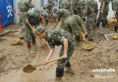連日來(lái),四川成都、綿陽(yáng)、廣元等地連降暴雨,北川縣擂鼓鎮(zhèn)因地震而松軟的山體被雨水浸泡后大量塌方,產(chǎn)生的泥石流沖毀了不少村莊和居民安點(diǎn)置點(diǎn)。四川預(yù)備役高炮師200余名官兵問(wèn)汛而動(dòng),冒著被飛石砸傷和被泥石流沖走的危險(xiǎn),翻山越嶺,徙步8小時(shí)趕赴災(zāi)區(qū),營(yíng)救被困群眾,搶救物資,排污去淤。圖為10月7日,官兵們?cè)谝粸?zāi)民安置點(diǎn)排污去淤。中新社發(fā) 王玖成 攝