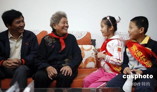 10月7日重陽節(jié),無錫市清揚實驗小學為提高少先隊員尊老、敬老、愛老意識,進一步營造全社會尊老愛老氛圍,結合“喜看家鄉(xiāng)改革開放30年巨變”,開展“和諧小使者訪名人”活動。在世界上第一個從北坡登上珠峰的女英雄——潘多的家中,無錫市清揚實驗小學的少先隊員們與潘多奶奶面對面地交流著。潘多奶奶勉勵少先隊員要在學習上要發(fā)揚“攀登”精神,克服困難,勇攀學習高峰。 中新社發(fā) 張浩 攝
