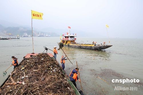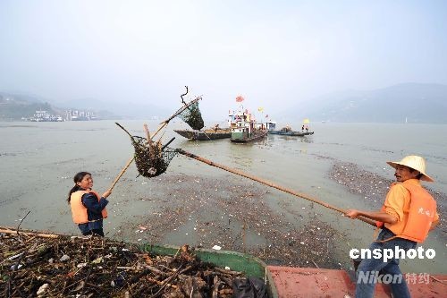 10月7日,由湖北秭歸環(huán)保局組織的清漂隊(duì)在三峽大壩上游西陵峽水域開(kāi)展清漂作業(yè)。當(dāng)日,為保障蓄水期間長(zhǎng)江航道安全和三峽電站正常發(fā)電,沿江各地緊急投入人力物力,啟動(dòng)大規(guī)模清漂行動(dòng)。中新社發(fā) 林中樹(shù) 攝
