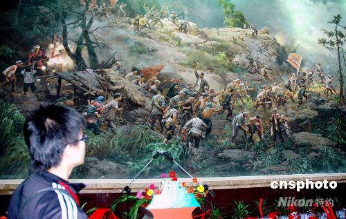 亞洲最大的油畫(huà)亮相江西井岡山。該油畫(huà)名為《黃洋界保衛(wèi)戰(zhàn)》,長(zhǎng)十二米,寬八米,由魯迅美術(shù)學(xué)院的四名教授歷時(shí)二個(gè)月精心創(chuàng)作而成。作品反映了一九二八年八月,紅軍憑險(xiǎn)據(jù)守井岡山黃洋界哨口粉碎進(jìn)行第二次“會(huì)剿”的國(guó)民黨軍的歷史,描繪了一百多個(gè)人物,色彩鮮艷,立體感極強(qiáng)。 中新社發(fā) 段長(zhǎng)征 攝