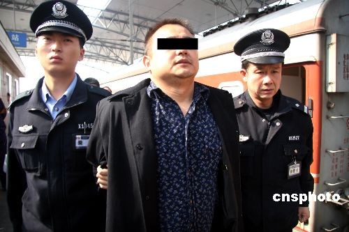 2008年10月13日,沈陽鐵路公安處乘警支隊(duì)在成都開往沈陽的北的K388列車上抓獲一名潛逃十年的殺人犯,犯罪嫌疑人池繼云是四川金堂縣人,1973年生人,1998年12月13日,他在四川省都江堰市風(fēng)行酒廊殺死2人重傷2人,十年來一直負(fù)案在逃,不想這次列車上被沈陽鐵路公安抓獲。中新社發(fā) 趙敬東 攝